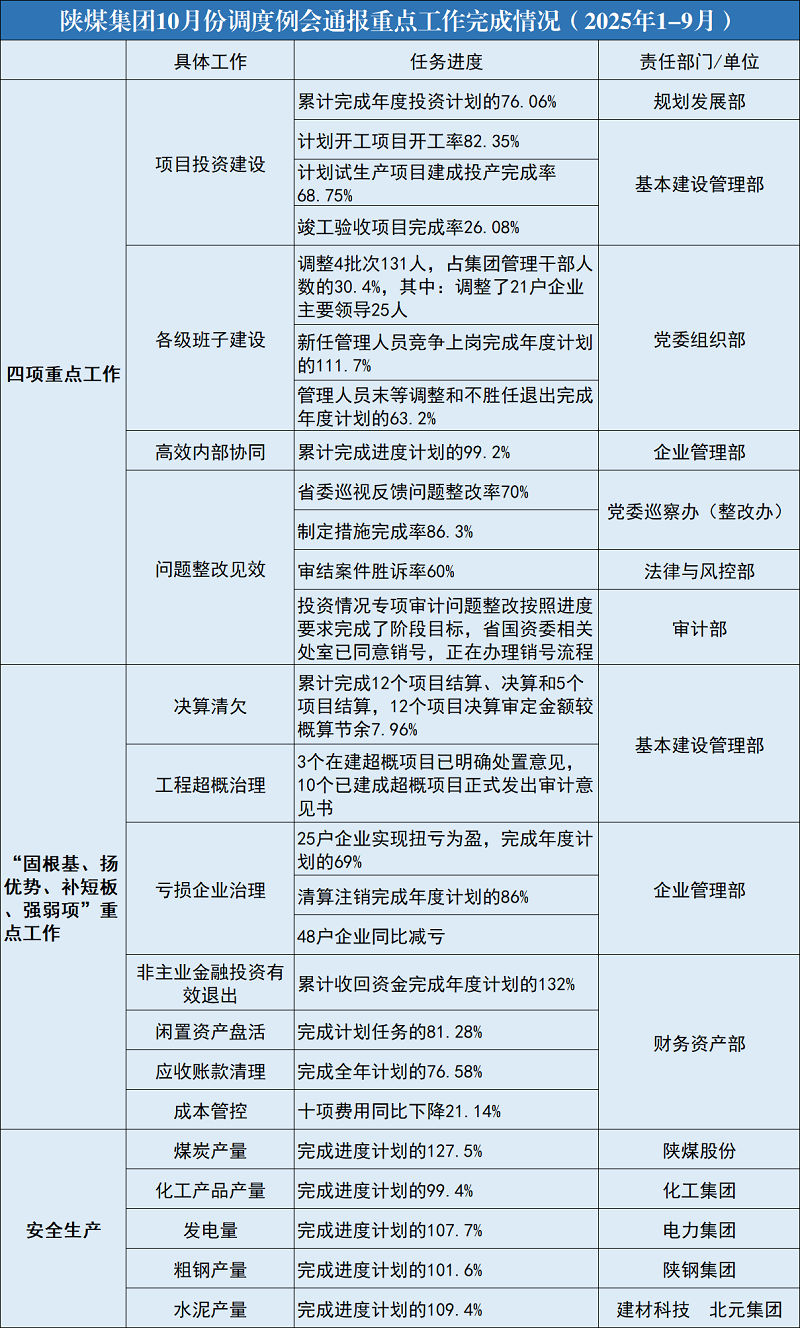 会议总结9月份重点任务完成情况,分析当前工作存在的问题和不足,安排10月份重点工作;相关职能部门分别汇报了项目投资建设,高效协同发展,各级领导班子建设,巡视巡察、内部审计、涉诉案件问题整改及安全环保、生产经营、闲置资产盘活、亏损企业治理等重点工作推进情况。张文琪逐一对各部门工作进展进行点评,肯定成绩、指出问题,并对下阶段工作提出明确要求。